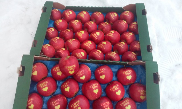 Sprzedam jabłka z napisem I LOVE YOU oraz KOCHAM CIĘ z serduszkiem. Jabłka są pięknie wybarwione. Napis powstał podczas naturalnego oddziaływania słońca na naklejkę. Jabłka są doskonałym prezentem na Walentynki oraz Dzień Kobiet. Odmiana - Jonagored. Posiadam Ceryfikat Integrowanej Produkcji.